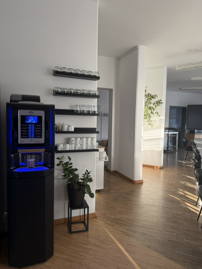 Zusätzlich stehen Getränke zur Verfügung. Ein Kaffeevollautomat mit verschiedenen Getränken sorgt für eine angenehme Pausenversorgung.