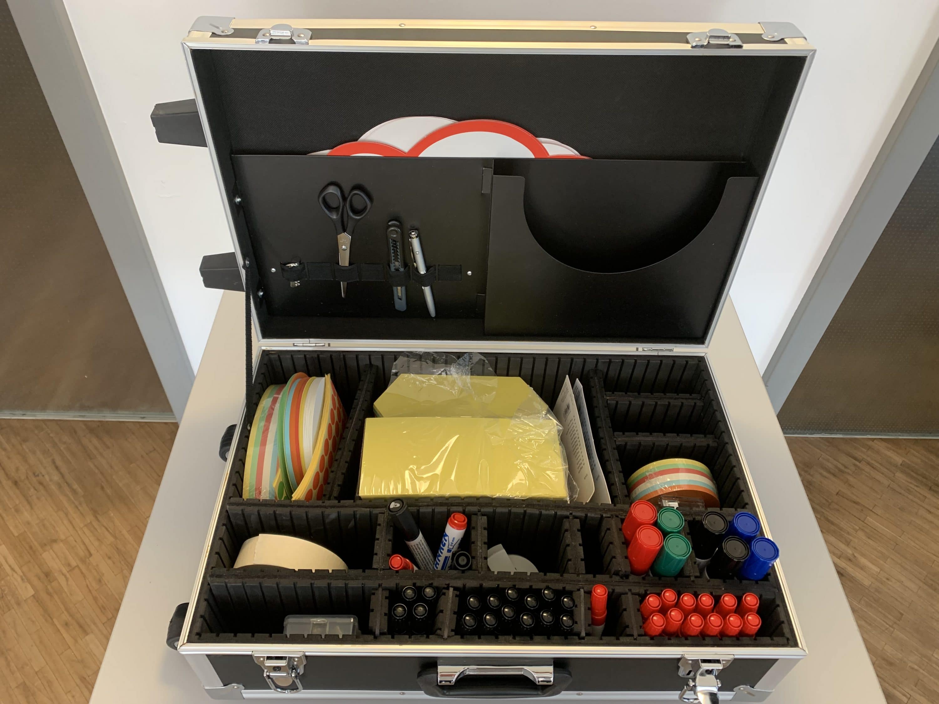 Ihnen stehen ein digitales 85" Whiteboard (Samsung Flip2), ein klassisches Whiteboard, eine Flipchart und Metaplanwände zur Verfügung. Außerdem können Sie auf einen voll ausgestatteten Moderationskoffer zurückgreifen.